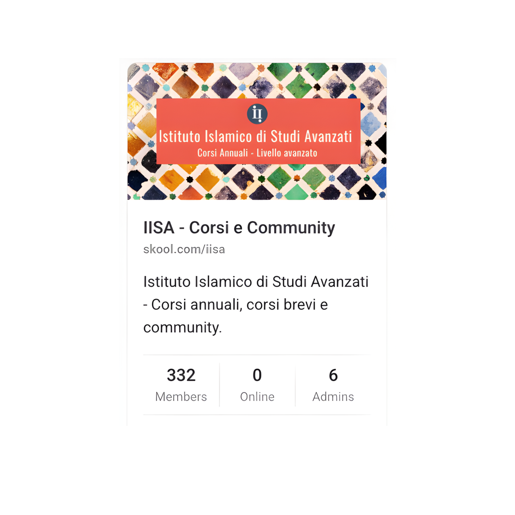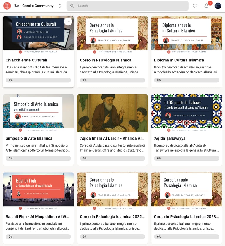 Per accedere ai nostri corsi, ti invitiamo a unirti alla Community ufficiale dell’Istituto su Skool. All'interno della piattaforma potrai gestire la tua formazione culturale e spirituale in modo diretto, connettendoti con una rete di persone animate dallo stesso desiderio di approfondimento e ricerca della conoscenza, così come insegnato dal nostro Profeta Muhammad ﷺ.
